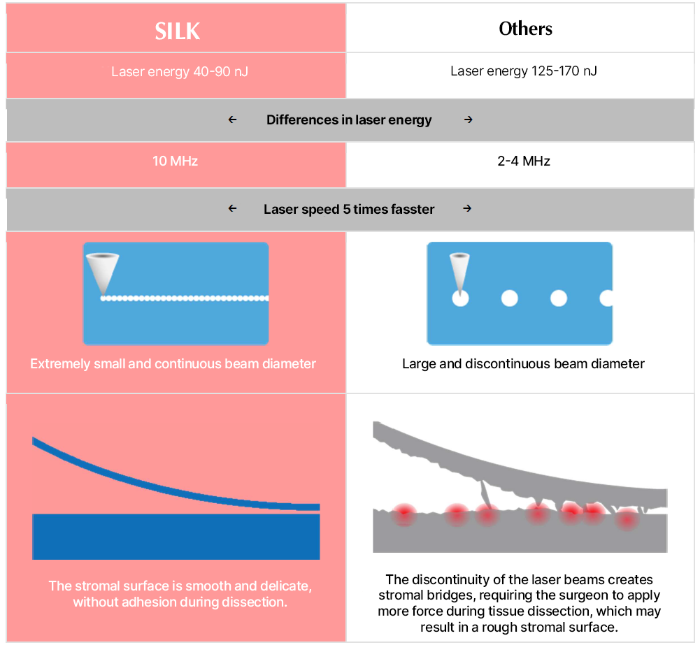 SILK uses lower laser energy, smaller spot spacing, and a higher pulse frequency - enhancing precision, minimizing corneal tissue damage, and optimizing treatment outcomes compared to ReLEX SMILE and SMILE Pro.
