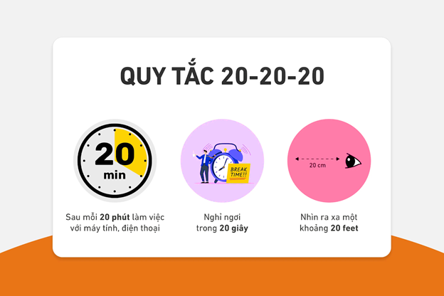 - Áp dụng quy tắc 20-20-20: Cứ mỗi 20 phút nhìn màn hình, hãy cho mắt nghỉ 20 giây và phóng tầm mắt ra xa 20 feet (khoảng 6 mét).
