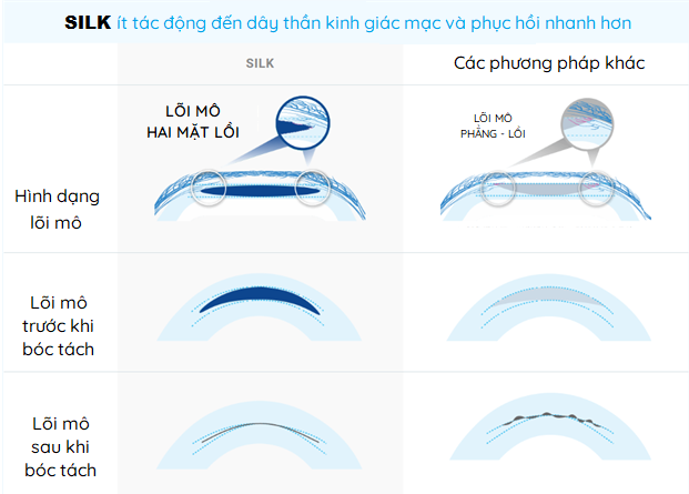 - Phẫu thuật SILK: Thiết kế lõi nhu mô hai mặt lồi, giúp phân bố năng lượng đồng đều, giảm tác động cơ học lên giác mạc và tăng độ mịn của bề mặt cắt.